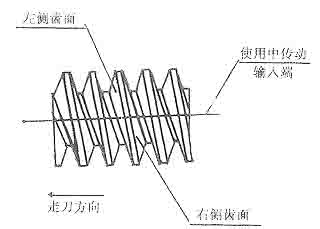 車(chē)蝸桿時(shí)由于螺旋升角的影響,輪齒右側(cè)齒面切削條件好,左側(cè)切削條件差。并且車(chē)左側(cè)齒面時(shí)車(chē)刀所受軸向切削力與走刀方向相同(見(jiàn)圖2),所以切削不平穩(wěn),齒形誤差比右側(cè)大。再如果滾蝸輪時(shí)滾刀桿的軸承間隙大,加工時(shí)產(chǎn)生讓刀,這樣蝸輪蝸桿嚙合時(shí)蝸輪輪齒一側(cè)接觸好,一側(cè)接觸差。因此在運(yùn)轉(zhuǎn)初期建議旋轉(zhuǎn)方向:從輸入端看蝸桿順時(shí)針?lè)较蛐D(zhuǎn),蝸輪旋轉(zhuǎn)方向與加工時(shí)相同(見(jiàn)圖1),反方向旋轉(zhuǎn)只能短時(shí)使用。