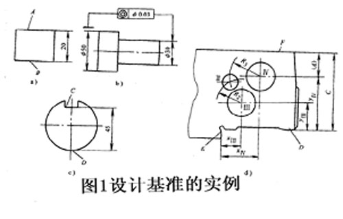 零件圖上可以確定零件上某些點、線、面位置所依據(jù)的點線、面。如圖1中,圖a所示零件,對尺寸20mm而言,A、B面互為設(shè)計基準(zhǔn);圖b所示零件,φ50mm圓柱面的設(shè)計基準(zhǔn)是φ50mm的軸線,φ30mm圓柱面的設(shè)計基準(zhǔn)是φ30mm的軸線,就同軸度而言,φ50mm的軸線是φ30mm軸線的設(shè)計基準(zhǔn);圖2-24c所示零件,圓柱頊下素線D是槽底面C的設(shè)計基準(zhǔn)。圖d所示主軸箱臬體,頂面F的設(shè)計基準(zhǔn)是底面D,孔Ⅱ軸線的設(shè)計基準(zhǔn)是孔Ⅲ和Ⅳ軸線。