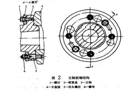 主軸前端采用短錐式結(jié)構(gòu)。安裝時,使事先裝在撥盤或卡盤座4上的四個雙頭螺母通過主軸肩及鎖緊盤2的圓柱孔,然后將鎖緊盤2轉(zhuǎn)過一個角度,雙并沒有螺柱5外于鎖緊盤的溝槽內(nèi),并擰緊螺釘1和螺母6,就可以使卡盤或撥盤可靠地安裝在主軸的前端。這種結(jié)構(gòu)裝卸方便,夾緊可靠,定心精度高;不高前端懸伸長度較短,有利于提高主軸組件的剛度,所以得到廣泛的應(yīng)用。主軸軸肩右端面上的圓形撥塊用于傳遞轉(zhuǎn)矩。主軸尾端的圓柱面是安裝各種輔具的安裝基面。