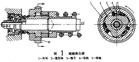 進(jìn)給過程中,當(dāng)進(jìn)給力過大或刀架移動(dòng)受到阻礙時(shí),為了避免損壞傳動(dòng)機(jī)構(gòu),在溜板箱中設(shè)置有安全離合器M7,使刀架在過載時(shí)能自動(dòng)停止進(jìn)給,所以亦稱之為進(jìn)給的過載保護(hù)裝置。安全離合器的工作原理見圖1,由光杠傳來的運(yùn)動(dòng)經(jīng)單向超離合器的外環(huán)好齒輪Z56,并通過滾子傳給星形體見圖2,再經(jīng)過平鍵傳至M7的左半部1,然后由其螺旋形端面齒傳至離合器的右半部2,再經(jīng)過花鍵傳至ⅩⅩ,離合器的右半部2后端的彈簧3的彈力,克服離合器在傳遞扭矩時(shí)所產(chǎn)生的軸向分力,使離合器左、右部分保持嚙合見圖2a