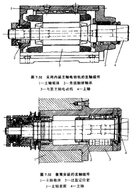 圖7-31所示是一種采用內(nèi)裝主軸電動(dòng)機(jī)的主軸組件(圖中為示出裝卸刀具及刀具夾緊機(jī)構(gòu)),簡化了主傳動(dòng)系統(tǒng)。圖7-32和圖7-33為用套筒安裝的主軸組件,這類主軸組件主軸支承跨距可以較短,主軸傳動(dòng)件位于主軸后部。