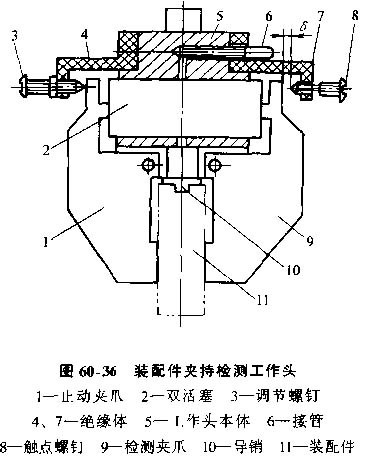 2) 裝配件夾持檢測工作頭,圖30-36所示工作頭根據夾持動作發(fā)出的信號,壓縮空氣進入接管6,推動雙活塞2,使止動夾爪1及檢測夾爪9閉合,開始夾持裝配件11。正常夾持時在夾爪9與觸點螺釘8之間形成間隙δ,兩者之間斷路。夾持失誤時間隙消失,夾爪9與螺釘8之間形成通路,通過控制回路發(fā)出報警信號。