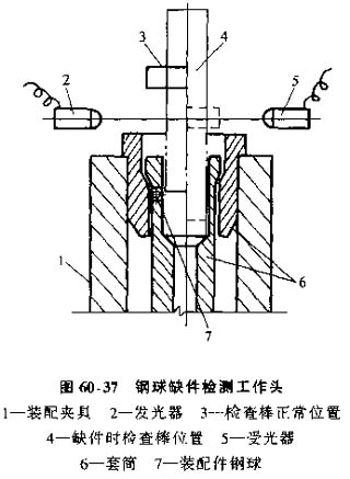 鋼球缺件檢測工作頭,圖60-37所示工作頭應用光電檢測鋼球缺件,圖中檢測棒前端的直徑要比裝入的三個均布鋼球的內接圓直徑略大。裝配正常時,檢測棒不能通過;當缺少一個鋼球時則可通過。用光電檢測棒所在的軸向位置,即可判斷是否缺件。