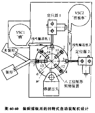 (1)搖板自動(dòng)裝配機(jī),圖60-59所示的搖板由搖板框及銷(xiāo)組成,用電阻焊聯(lián)接。