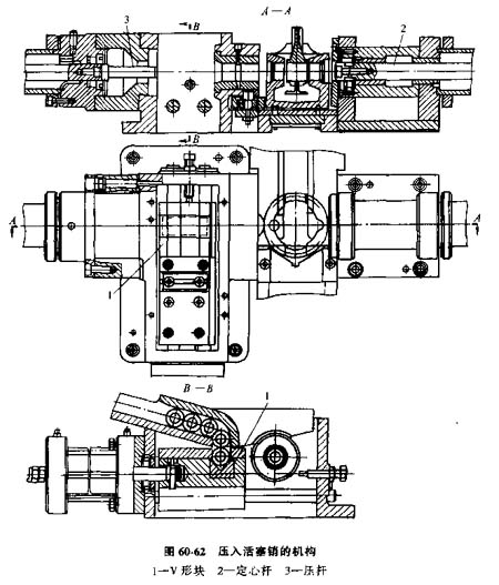 壓入活塞機(jī)構(gòu);在活塞被送到與連桿、活塞銷(xiāo)裝配的工位后,活塞銷(xiāo)也被送到位,然后將活塞銷(xiāo)壓入。見(jiàn)圖60-62。活塞銷(xiāo)的送進(jìn)用專(zhuān)用裝置實(shí)現(xiàn),利用直角V形塊1夾住活塞銷(xiāo),并使銷(xiāo)沿導(dǎo)軌移到其軸線與定心桿2和壓桿3的軸線重合的位置。在壓入活塞銷(xiāo)前;钊c連桿一起用定心桿2同時(shí)定向;壓入活塞銷(xiāo)后,定心桿2被壓桿3擠出來(lái),在工位1上裝配好的一套連桿活塞被提升上去,再由步距桿式運(yùn)輸器用擺桿運(yùn)向下一個(gè)裝配區(qū)。