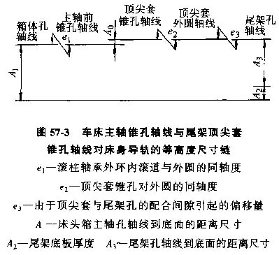 如果仔細查找,可以得到如圖57-2所示的以前、后頂尖高度差為封閉環(huán)的裝配尺寸連,相關零件有圖中的床頭箱、軸承、箱體、尾座頂尖套,尾座、尾座底板及圖中未示出的前、后頂尖和床身等。