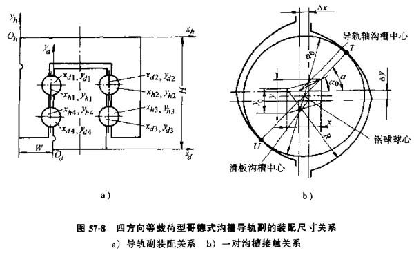 圖57-8a為哥德式直線滾動導(dǎo)軌副的裝配關(guān)系,圖57-8b為一對溝槽的鋼球接觸關(guān)系。該導(dǎo)軌副有四對溝槽,滑板與導(dǎo)軌軸各對溝槽的設(shè)計(jì)中心并不在同一點(diǎn),分別位于圖57-8a中的Xhi,Yhi和Xdi,Ydi(i=1,2,3,4),h表示滑板,d表示導(dǎo)軌軸。裝配后鋼球在溝槽中的過盈量是主要的裝配精度要求之一。