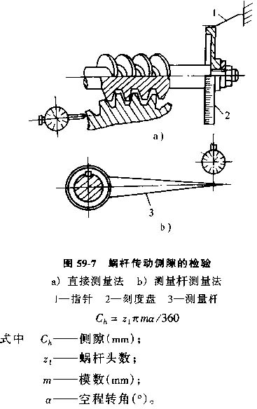 蝸桿傳動的側(cè)隙一般用打表法測量。打表測量方法與測量齒輪副隙所用的相似,見圖59-7。固定蝸輪。在蝸桿軸上聯(lián)一個帶量角器的刻度盤2,測量表頭頂在蝸輪齒面上。傳動蝸桿,在量表指針不動的條件下,用刻度盤相對固定指針1的最大轉(zhuǎn)角換算出側(cè)隙值。若測量表頭難以直接與蝸輪齒面接觸,可以在蝸輪軸上裝一根測量桿3。側(cè)隙與轉(zhuǎn)角的換算關(guān)系為: