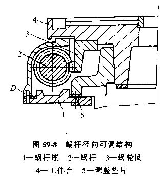 實現(xiàn)側(cè)隙調(diào)整可用徑向調(diào)或軸向可調(diào)結(jié)構(gòu),蝸桿徑向可調(diào)結(jié)構(gòu)見圖59-8。這種蝸桿傳動的加工工藝一般是:待蝸輪圈3裝合在刮研好的工作臺4上精加工無論癡面后,按齒面接觸斑點分布狀況,配磨蝸桿2的齒面。在檢驗機(jī)上按一定的中心距,檢查蝸輪齒面接觸斑點,確保在規(guī)定的嚙合側(cè)隙情況下達(dá)到正常接觸,然后進(jìn)行裝配。裝配時,先刮研蝸桿座1的裝配基準(zhǔn)D,并保證蝸桿座上裝蝸桿的軸承孔的軸線對D面的平行度精度。配磨調(diào)整墊片5,以保證蝸桿軸線位于蝸輪齒的中央截面內(nèi)。同時徑向微調(diào)蝸桿座,達(dá)到規(guī)定的接觸斑點后,配鉆、鉸蝸桿座與底座的定位銷孔,裝上定位銷,擰緊螺釘。