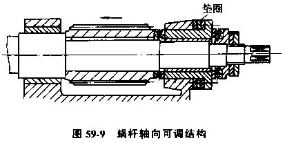 蝸桿軸向可調(diào)結(jié)構(gòu)見圖59-9。這種結(jié)構(gòu)的蝸桿必須是變齒厚蝸桿,即蝸桿兩側(cè)螺旋面的導(dǎo)怔不同。這種蝸桿傳動容易調(diào)整側(cè)隙,且調(diào)整時不改變中心距離,從而不改變接觸精度和運動精度。根據(jù)保證側(cè)隙所要求的修配量,將墊圈1磨薄,使蝸桿的厚齒端向圖示箭頭方向移動一個相應(yīng)的量即可。