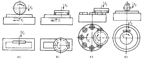 平面磨床用于摸小各種零件的平面。平面磨床的砂輪主軸有臥軸和立軸之分,安裝工件的工作臺(tái)有矩形工作臺(tái)兩種。根據(jù)砂輪主軸位置和工作臺(tái)形狀的不同,普通平面磨床主要有臥軸矩臺(tái)平面磨床、立軸矩態(tài)平面磨床、立軸圓臺(tái)平面磨床、臥軸圓臺(tái)平面磨床四種類型(見圖)