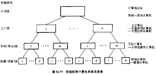 通常,柔性制造系統(tǒng)采取分層(級(jí))、分布式集中管理的控制結(jié)構(gòu),圖52-76表示了以多級(jí)計(jì)算機(jī)體系與結(jié)構(gòu)數(shù)據(jù)庫(kù)共享支撐下的分級(jí)管理塔。每一級(jí)計(jì)算機(jī)輔助一個(gè)相應(yīng)的管理層,計(jì)算機(jī)分為兩層或幾層,圖52-76為3級(jí)(層)計(jì)算機(jī)結(jié)構(gòu),圖52-77為4級(jí)計(jì)算機(jī)結(jié)構(gòu),一般公司級(jí)控制多用4級(jí)控制網(wǎng)絡(luò),工廠級(jí)控制多用3級(jí)分層控制網(wǎng)絡(luò)。對(duì)于柔性制造系統(tǒng),比較先進(jìn)的采用3級(jí)控制網(wǎng)絡(luò)。有時(shí)把計(jì)算機(jī)分層的級(jí)稱為控制級(jí)。