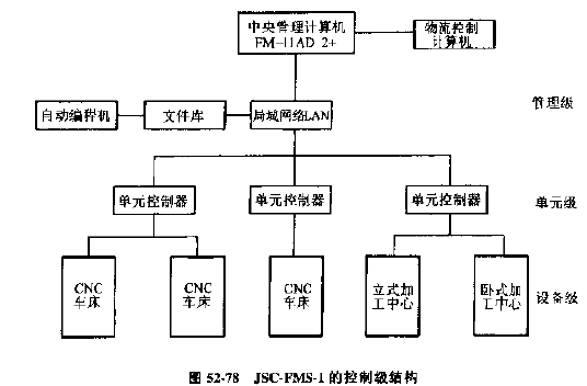 圖52-78所示是北京機(jī)床研究所的JCS-FMS-1柔性制造系統(tǒng)的控制級(jí)的控制結(jié)構(gòu)框圖。中央管理級(jí)由主控機(jī)和物流控制計(jì)算機(jī)組成,主計(jì)算機(jī)硬件為FM-11AD2+微型計(jì)算機(jī),配置了OS-9操作系統(tǒng),軟件采用C語(yǔ)言。物流控制用PMS微型計(jì)算機(jī),該FMS有三個(gè)單元級(jí)控制,每個(gè)單元直接通過(guò)局域網(wǎng)絡(luò)與主計(jì)算機(jī)連接,接受中央計(jì)算機(jī)的指令,并把它們分配給設(shè)備控制級(jí)的5臺(tái)機(jī)床,其物流系統(tǒng)由15臺(tái)倉(cāng)庫(kù)托盤(pán)站構(gòu)成的平面?zhèn)}庫(kù),加工單元托盤(pán)站、無(wú)人自動(dòng)搬運(yùn)小車等組成,根據(jù)主計(jì)算機(jī)的運(yùn)行指令完成物流運(yùn)行與管理,其設(shè)備級(jí)采用DNC/FMC型控制,通信采用光纖電纜傳輸,并在全線上布置了5個(gè)監(jiān)視攝像系統(tǒng)和工業(yè)電視對(duì)物流與設(shè)備進(jìn)行監(jiān)視。