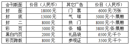 A區(qū):國內(nèi)企業(yè) RMB 7500/展位/展期 光地:國內(nèi)企業(yè) RMB 760/m²/展期 B區(qū):國內(nèi)企業(yè) RMB 6800/展位/展期 光地:國內(nèi)企業(yè) RMB 680/m²/展期 境外企業(yè) USD 1600/展位/展期 光地:境外企業(yè) USD 160/m²/展期 2、標(biāo)準(zhǔn)展位費用:包括展出場地、三面展板,楣板1塊,洽談桌1張,椅子2把,射燈2盞,220V插座一只;雙開口展位加收10%的展位費用。(光地:36㎡起租,展商需自行設(shè)計及布置展位)