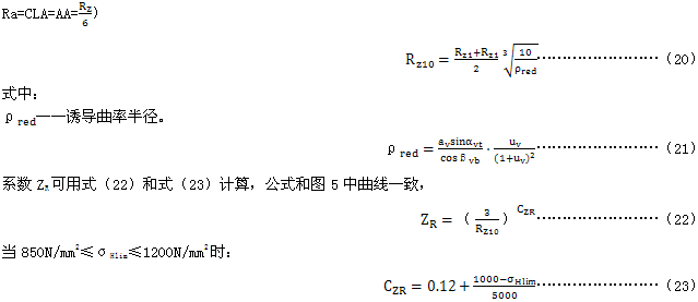 根據(jù)14.2的規(guī)定,粗糙度系數(shù)ZR是考慮齒面狀況對接觸疲勞(點蝕)強度的影響。圖5中的粗糙度系數(shù)曲線是Rz10和配對齒輪中較軟齒輪材料σHlim的函數(shù)。該圖對節(jié)點處誘導曲率半徑 的齒輪副是有效的。