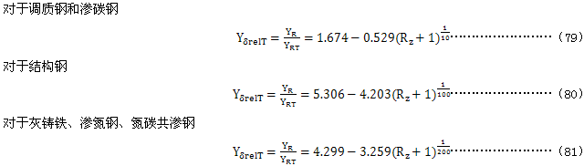 相對(duì)齒根表面狀況系數(shù)YδrelT可按粗糙度和材料從圖9查得,圖中曲線是用試件做試驗(yàn)得到的;也可用式(76)~式(81)計(jì)算。