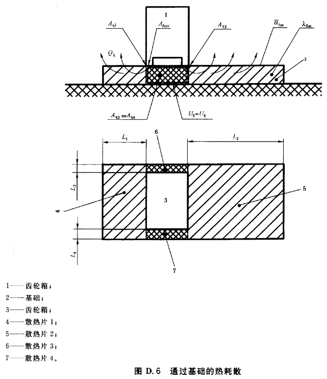 基礎(chǔ)傳導(dǎo)的熱計(jì)算是建立在將齒輪箱基礎(chǔ)分割成幾個(gè)部分,每一部分被看作為一個(gè)單獨(dú)的散熱片,使用從熱力學(xué)得出的已知散熱片計(jì)算公式。沿各部分表面的熱流Aqi相加得到整個(gè)基礎(chǔ)的熱傳導(dǎo)量(見圖D.6)。