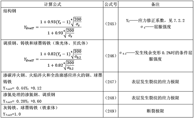靜強(qiáng)度的YδrelT值可按表31中的相應(yīng)公式計(jì)算得出(當(dāng)應(yīng)力修正系數(shù)在1.5<YS<3的范圍內(nèi)時(shí),靜強(qiáng)度的相對(duì)敏感系數(shù)YδrelT近似地可取為:YS/YST;但此近似數(shù)不能用于氮化的調(diào)質(zhì)鋼與灰鑄鐵)。