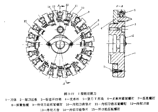 Ⅰ型雙面及三面粗切銑刀用于粗加工弧齒錐齒輪和準(zhǔn)雙曲面齒輪副中的大、小齒輪。該銑刀刀體硬度高、剛性好、刀齒采用T型塊夾緊,結(jié)構(gòu)緊湊,刀齒數(shù)量多,且裝卸靈活方便,銑刀有A、B兩中型式的錐孔直徑,A型孔適用于國(guó)產(chǎn)機(jī)床,B型孔適用于進(jìn)口格里森機(jī)床或新型仿制機(jī)床。銑刀公稱直徑有3.75,4.5,5,6,7,5,9,10.5,12,14,16,18in等十一種,其結(jié)構(gòu)型式和基本尺寸見圖3-77和表3-152~153。