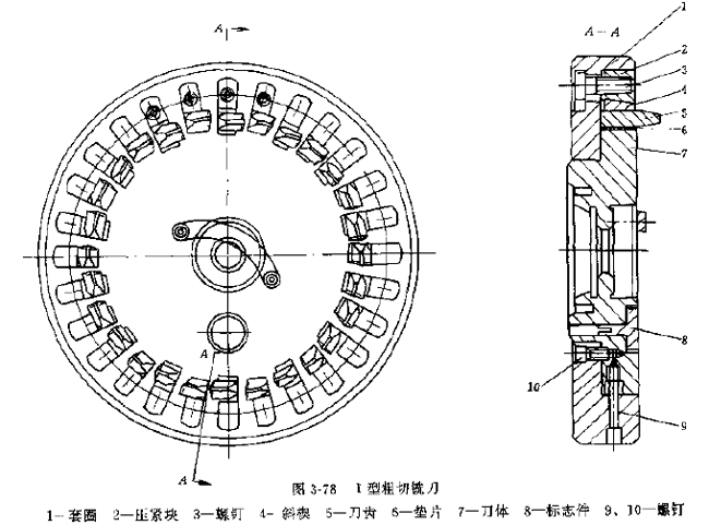 Ⅱ型雙面及三面粗切銑刀也是用于粗加工弧齒錐齒輪和準雙面齒輪副中的大、小齒輪。該銑刀結構先進,刀體強度高,剛性好,刀齒采用斜楔夾緊,刀齒分布緊湊,刀齒數(shù)量多,而且刀齒安裝靈活方便,這種銑刀只能用于進口的格里森機床或新型仿制機床上。銑刀公稱直徑有5、6、6.25、7.5、9等五種,其結構型式和基本尺寸見圖3-78和表3-154~表3-155。