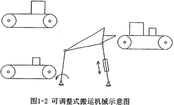 圖1-2所示是一種可調(diào)整曲柄搖桿機(jī)構(gòu)組成的搬運(yùn)機(jī)械。其中,一個(gè)普通電機(jī)驅(qū)動(dòng)曲柄等速回轉(zhuǎn),在搖桿上還安裝有一個(gè)控制電機(jī)。該機(jī)械的工作原理為:右邊的傳送帶上送來的箱子有大有小。要求將大箱子般到左上方的傳送帶上,而將小箱子般到左下方的傳送帶。恰當(dāng)設(shè)計(jì)連桿機(jī)構(gòu)的尺度,并利用控制電機(jī)來調(diào)整搖桿的長(zhǎng)度,可以分別完成上述任務(wù)。