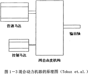 其基本原理如圖1-3所示,一個(gè)普通馬達(dá)和一個(gè)控制馬達(dá)分別驅(qū)動(dòng)一個(gè)兩自由度機(jī)構(gòu)的兩個(gè)輸入構(gòu)件。設(shè)計(jì)者期望通過機(jī)械與馬達(dá)的恰當(dāng)配合,使得普通馬達(dá)提供系統(tǒng)所需的主要功率,而控制馬達(dá)僅提供佼小的輔助功率,但還能夠?qū)敵鲞\(yùn)動(dòng)進(jìn)行控制;旌蟿(dòng)力機(jī)器的研究動(dòng)機(jī)之一是期望以一個(gè)大功率(大扭矩)的普通馬達(dá)、一個(gè)小功率(小扭矩)的控制馬達(dá)、以及一個(gè)機(jī)構(gòu)的組合系統(tǒng)來替代一個(gè)大功率(大扭矩)的控制馬達(dá),從而降低成本;旌蟿(dòng)力機(jī)器的研究動(dòng)機(jī)之二是期望利用機(jī)構(gòu)具有的高機(jī)械利益(與控制馬達(dá)和負(fù)載直接耦合的清形比較而言)來提高運(yùn)動(dòng)控制的精度及穩(wěn)定性。