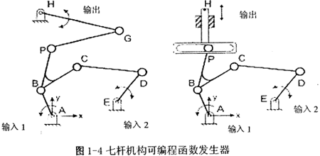 Bhartendu Seth和Sesha Sai Vaddi提出基于混合動(dòng)力機(jī)器思想的可編程函數(shù)發(fā)生器(Programmable function generators),如圖l-4所示分別為七桿機(jī)構(gòu)的兩種設(shè)計(jì)。