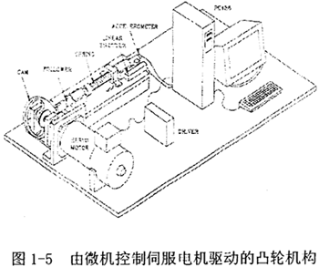 近年來,顏鴻森等人致力于有關(guān)變輸入轉(zhuǎn)速凸輪機(jī)構(gòu)的研究,其具體成果為通過仿真和試驗(yàn)驗(yàn)證消除了從動(dòng)件的運(yùn)動(dòng)特性曲線的不連續(xù)性,及降低了各種凸輪曲線(如擺線、多項(xiàng)式曲線等)的從動(dòng)件和加速度峰值。其實(shí)驗(yàn)系統(tǒng)如圖1-5所示,其中微機(jī)控制的伺服電機(jī)作為變速單元,以直動(dòng)滾子從動(dòng)件平面凸輪機(jī)構(gòu)為執(zhí)行機(jī)構(gòu)。