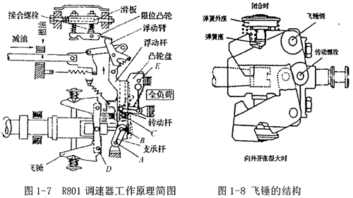 圖1-7為R801調(diào)速器的工作原理簡(jiǎn)圖,圖1-8為飛錘結(jié)構(gòu)圖。該調(diào)速器采用特殊的凸輪機(jī)構(gòu)和浮動(dòng)桿的可變杠桿比(1.1~5.4)進(jìn)行調(diào)速,可獲得多種適應(yīng)特性。在調(diào)速器上部,裝有全負(fù)荷限位機(jī)構(gòu),用于確定限位凸輪的位置。調(diào)整全負(fù)荷限位機(jī)構(gòu),將使滑板左右移動(dòng)。擰出或擰進(jìn)接合螺栓,可調(diào)整限位凸輪上下移動(dòng)偏轉(zhuǎn)一微小角度,以此改變限位凸輪型線方程。操縱手柄和轉(zhuǎn)動(dòng)桿固定在操縱手柄軸上,轉(zhuǎn)動(dòng)桿帶動(dòng)導(dǎo)向軸,導(dǎo)向軸的一端沿凸輪盤中滑槽的型線作運(yùn)動(dòng)。其另一端帶有一滑塊,滑塊在圓柱形的浮動(dòng)桿內(nèi)上下移動(dòng),以此實(shí)現(xiàn)可變杠桿比。如調(diào)節(jié)手柄轉(zhuǎn)到“怠速”位置時(shí),浮動(dòng)臂不與限位凸輪接觸,此時(shí)限位凸輪不起作用。如果發(fā)動(dòng)機(jī)轉(zhuǎn)速超過設(shè)定的轉(zhuǎn)速,則飛錘更張開,使滑動(dòng)螺栓左移,B點(diǎn)繞A點(diǎn)逆時(shí)針轉(zhuǎn)動(dòng),同時(shí)浮動(dòng)桿繞C點(diǎn)按順時(shí)針方向轉(zhuǎn)動(dòng),拉引調(diào)節(jié)齒桿向“怠速”位置移動(dòng),而使發(fā)動(dòng)機(jī)轉(zhuǎn)速下降。如果怠速時(shí)柴油機(jī)轉(zhuǎn)速下降,則會(huì)產(chǎn)生與上述相反的過程。