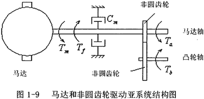 如圖1-9所示的馬達(dá)和非圓齒輪驅(qū)動(dòng)系統(tǒng),如果沒有加設(shè)一對(duì)非圓齒輪,馬達(dá)提供給凸輪軸的是一個(gè)恒定的速度(理論上),加了非圓齒輪后,通過非圓齒輪節(jié)線的設(shè)計(jì),為凸輪軸傳遞一個(gè)可變的速度輸入函數(shù),從而產(chǎn)生所要求的速度輸出函數(shù)。