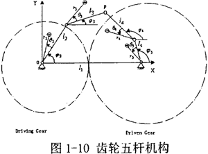 3.設(shè)計(jì)空問受約束于拓?fù)浣Y(jié)構(gòu)與構(gòu)件的受力條件。例如,雖然四桿機(jī)構(gòu)最為簡(jiǎn)單實(shí)用,但是仍有許多性能要求更高的場(chǎng)合不得不采用多桿機(jī)構(gòu)(如圖l-10所示的齒輪五桿機(jī)構(gòu),圖中圓齒輪分別與桿l2·l5固連)。