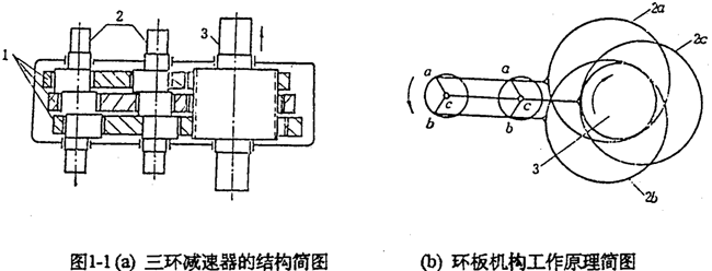 隨著少齒差傳動應用日益廣泛,國內(nèi)外學者在齒形分析、結(jié)構(gòu)優(yōu)化、接觸分析、結(jié)構(gòu)強度、動態(tài)性能、傳動效率、運動精度等方面進行了大量的研究,取得了許多有價值的成果,并成功地開發(fā)出不少新少齒差行星傳動形式。目前,我國正在研究、生產(chǎn)很熱門的一種連桿行星齒輪傳動——平行軸式少齒差內(nèi)齒行星齒傳輸線傳動。該類傳動是以連桿內(nèi)齒輪(齒輪)為行星齒輪,采用雙曲柄輸入,且元輸出機構(gòu)。主要有一齒環(huán)(一片連桿行星齒板)=、二齒環(huán)(二片連桿行星齒板)、三環(huán)(三片連桿行星齒板)及四環(huán)(四片行星齒板)等結(jié)構(gòu)形式的減速器。圖1-1是三環(huán)減速器的基本結(jié)構(gòu)及工作原理簡圖。兩根互相平行且各具有三個偏心軸頸(或偏心套)的高速軸2,動力通過其中任一軸或兩軸同時輸入,三片連桿行星齒板(內(nèi)齒輪)1通過軸承裝在高速軸上,外齒輪3的軸為低速軸,其軸線與高速軸2軸線平行,高、低速軸均通過軸承支承在機體上。三片齒板1與外齒輪3嚙合,嚙合的瞬時相位差呈120°角。