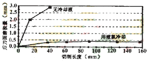 在車刀前刀面上倒裝了個(gè)金屬帽狀物,其內(nèi)腔與刀片的上表面共同組成一個(gè)密閉室。帽狀物上有液氮的入口和出口。在干切削過(guò)程中,液氮不斷在密閉室中流動(dòng),吸收刀片上的切削熱,使刀具不產(chǎn)生過(guò)高的溫升.始終保持良好的切削性能,順利實(shí)現(xiàn)干切削。圖4是用PCBN刀具加工RBSN工件材料時(shí)刀具磨損量的實(shí)驗(yàn)結(jié)果。在不使用液氮冷卻刀具時(shí)PCBN刀具車削長(zhǎng)度僅40mm,后刀面磨損量便高達(dá)3mm,切削無(wú)法再進(jìn)行下去。采用上述液氮裝置后,刀具磨損情況大為改善,車削長(zhǎng)度160mm后,后刀面僅磨損0.4mm。被加上工件的圓度誤差也從20μm減至3.2μm。液氮是一種很容易獲得的原料價(jià)格便宜還可以反復(fù)使用。