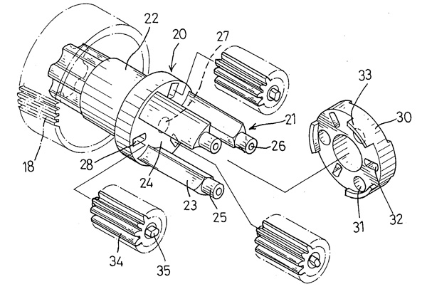 | 一種減速機(jī)自動(dòng)導(dǎo)正機(jī)構(gòu),其是包括: 一本體,該本體一端形成為一開(kāi)放端,且另端為封閉端,于該封閉端外周連設(shè)有一傳動(dòng)齒輪,該本體的開(kāi)放端端面上等分間隔有三個(gè)隔柱以及三個(gè)容置空間,且于三個(gè)隔柱朝開(kāi)放端各凸設(shè)有一凸柱,該本體各于容置空間朝封閉端處凹設(shè)有一長(zhǎng)槽; 三個(gè)容置于該容置空間的行星齒輪,該行星齒輪中央樞穿有一樞柱,而使該行星齒輪容置于該本體的容置空間內(nèi),且該樞柱的一端以容設(shè)于該本體的長(zhǎng)槽內(nèi); 一封閉于該本體封閉端末端而呈環(huán)狀的封蓋,該封蓋于環(huán)面上設(shè)有三個(gè)穿孔,以供該本體的三個(gè)凸柱對(duì)應(yīng)貫穿該穿孔,且抵頂于該本體的三個(gè)隔柱頂面,而該封蓋對(duì)應(yīng)該行星齒輪的樞柱設(shè)有一長(zhǎng)槽,使該等行星齒輪兩端凸出的樞柱各定位于封蓋及該本體的長(zhǎng)槽間。 |