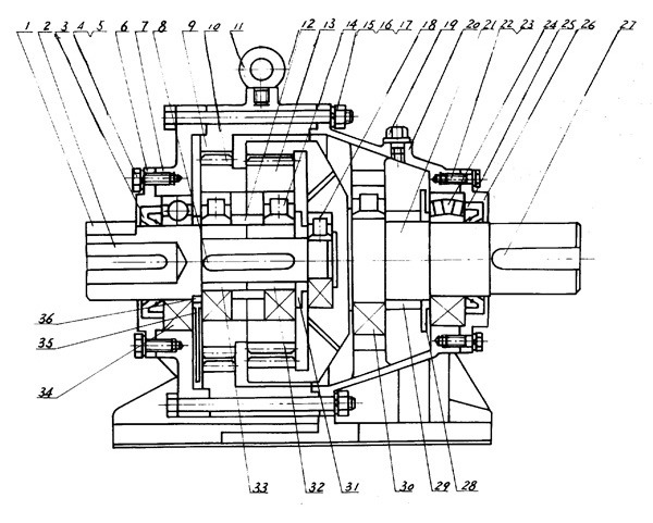 一種減速機,它主要包括輸入軸、輸出軸、傳動齒輪、軸承和外殼構成,輸入軸通過鍵連接齒輪,最后齒輪再通過輸出軸,其特征在于它還包括固定齒輪、偏心套、行星齒輪、凸凹塊和螺栓構成; 輸入軸(2)經過偏心套(33)通過軸承(14)與輸入行星齒輪(10)連接,輸入軸2上的行星齒輪(10)圍繞殼體(9)上固定齒輪部分旋轉,而殼體(9)與端蓋(7)、(20)經過螺栓(15)連接固定;輸入軸(2)上的行星齒輪(10)與行星齒輪(13)通過之間凸凹塊鑲入連接同步運轉,行星齒輪(13)再與輸出軸(21)齒輪部分嚙合連接。 輸入軸(2)由軸承(34)、軸承(18)支承,而軸承(18)裝在輸出軸(21)的中心線上,軸承(34)裝在端蓋(7)上,輸出軸(21)由軸承(30)和軸承(24)支承,軸承(30)和(24)安裝在端蓋(20)上,端蓋(7)、(20)通過各自止口定位與殼體(9)用螺栓(15)固定。