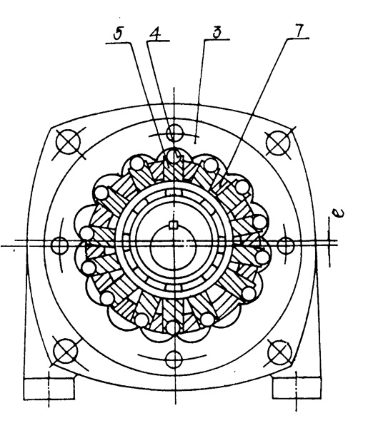 | 一種適用于機(jī)械傳動(dòng)裝置的內(nèi)齒減速機(jī),包括由輸入軸(1)聯(lián)接的偏心機(jī)構(gòu)及驅(qū)動(dòng)圈(7),固齒圈(3)等部分組成,其特征在于沿驅(qū)動(dòng)圈(7)外圓徑向開設(shè)有等分導(dǎo)槽,并與驅(qū)動(dòng)圈(7)的內(nèi)環(huán)槽相通,在每個(gè)等分導(dǎo)槽的兩邊裝有擋塊(6),使之形成四周封閉的槽孔,在槽孔內(nèi)裝有滑桿(5),滑桿(5)的一端呈R形面,并裝有滾動(dòng)體(4)在槽孔中作徑向滑動(dòng),同時(shí)滾動(dòng)體(4)與固齒圈(3)嚙合,滑桿(5)的另一端呈平面或弧面,接觸于偏心機(jī)構(gòu)中的雙偏心凸輪(2)的軸承外圈上,在雙偏心凸輪(2)上裝有與滑桿(5)嚙合的滾動(dòng)軸承(10)。 |