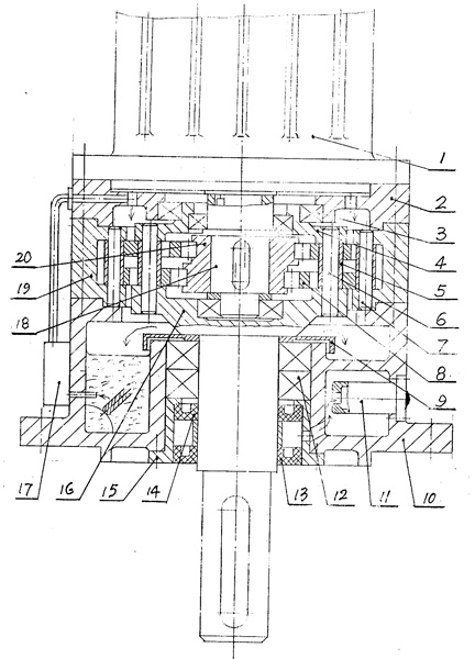 一種釜用不泄漏減速機(jī),由擺線輪[8]、輸入軸[18]、偏心軸承[20]、機(jī)座[10]、針齒輪及W輸出機(jī)構(gòu)組成,其中針齒輪由針齒殼[19],均布在針齒殼上的針齒[7]構(gòu)成,W機(jī)構(gòu)由輸出軸[16]與均布在輸出軸圓盤上的柱銷[6]及柱套[5]構(gòu)成,其特征在于: a)機(jī)座[10]內(nèi)有一儲(chǔ)油腔,機(jī)座外壁有一油泵[17]用來將儲(chǔ)油腔的潤(rùn)滑油泵至減速機(jī)頂端由上而下對(duì)機(jī)件進(jìn)行潤(rùn)滑; b)在輸出軸支承軸承[12]頂端有一圓環(huán)蓋[9],其高度高于儲(chǔ)油面1~3cm,用以防止從沿輸出軸漏油; c)在輸出軸軸承[12]下端有一個(gè)密封組件,它由套筒[15]及裝在套筒內(nèi)的密封[13]、[14]構(gòu)成,二密封之間要有一定空間,密封組件用以防止有毒介質(zhì)從反應(yīng)釜中泄漏到減速機(jī)內(nèi)腔。