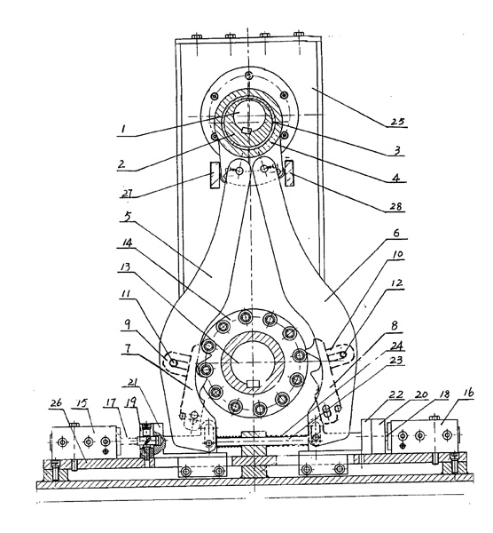 | 一種換向減速機包括殼體,換向裝置,主動輪,被動輪,輸出軸,輸入軸,其特征在上述所述的輸入軸(1)上固定偏心輪(2),偏心輪(2)外圓上有偏心軸承(3),偏心輪軸承(3)外圓上有拉板套(4),拉板套(4)上分別鉸連左拉板(5)、右拉板(6);左拉板(5)上鉸連左拉鉤(7),左拉鉤(7)上固定左拉鉤導塊(9);用左拉鉤導塊銷(11)與左拉板(5)鉸連;在右拉板(6)上鉸連右拉鉤(8),右拉鉤(8)上固定右拉鉤導塊(10)用右拉鉤導塊銷(12)與右拉板(6)鉸連,在輸出軸(13)上固定套筒滾子輪(14),在底板(26)上固定左程控液力缸(15)、右程控液力缸(16),左拉板導板(21),右拉板導板(22);在左程控液力缸(15)內(nèi)裝左柱塞(17),用左拉板鎖定器(19)與左拉板導板(21)連接,在右程控液力缸(16)內(nèi)裝有右柱塞(18),用右拉板鎖定器(20)與右拉板導板(22)連接,解鎖彈簧(24)套在推桿(23)上,拉板套(4)兩側(cè)設置有左限位板(27),右限位板(28)。 |