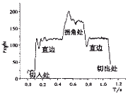 圖4 薄壁(腹板)加工示意圖 例如在對(duì)一個(gè)帶有腹板的矩形框體件加工中,銑刀從試件中間位置傾斜下刀,在深度方向銑到最終尺寸,然后一次走刀由中間向四周螺旋擴(kuò)展至側(cè)壁。實(shí)驗(yàn)研究表明,該方法較為有效的降低了切削變形及其影響,降低了由于剛性降低而能發(fā)生的切削振動(dòng)的可能,零件的質(zhì)量和加工效率也有了顯著提高。 對(duì)于腹板的銑削加工,文獻(xiàn)中介紹的工藝方法也值得參考。其具體方法如下:①刀具軌跡避免重復(fù),以免刀具碰傷暫時(shí)變形的切削面;②粗加工分層銑削,讓應(yīng)力均勻釋放;③采用往復(fù)斜下刀方式以減少垂直分力對(duì)腹板的壓力;④保證刀具處于良好的切削狀態(tài)。當(dāng)然,該方法僅在走刀路徑方面進(jìn)行優(yōu)化,還需結(jié)合其它方法(如使用真空夾具等)進(jìn)一步控制加工變形。 3 圓角加工的刀具路徑優(yōu)化方案 常規(guī)NC加工在制定刀具走刀路徑的時(shí)候,一般采用等切厚切削,即在一次走刀過程中徑向切深為一定值。但是,在圓角過度處,加工問題較大。在高速銑削加工薄壁結(jié)構(gòu)時(shí), 問題尤為顯著。在我們的圓角切削力實(shí)驗(yàn)中,可以發(fā)現(xiàn)刀具在圓角處的切削力有顯著的突變(見圖5)。