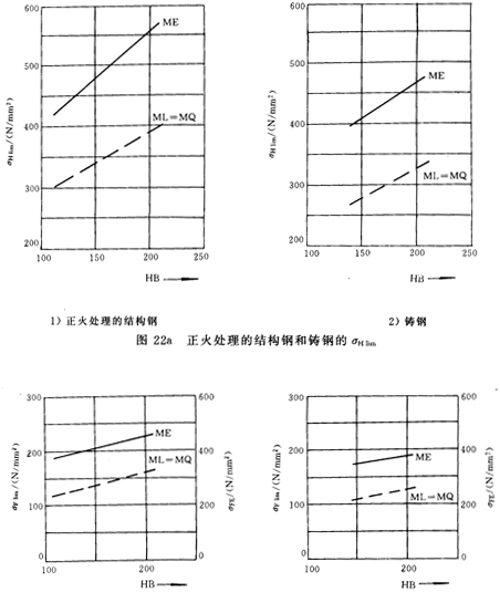 無資料時(shí),可參考圖22~圖26根據(jù)材料和齒面硬度查取σHlim和σFlim值。