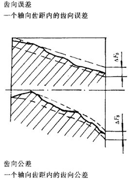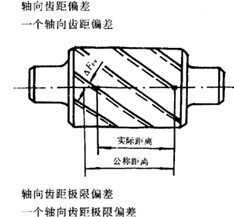 在有效齒寬范圍內(nèi),與齒輪基準軸線平行面大約通過凸齒或凹齒中部的一條直線上,任一軸向齒距內(nèi),兩個同側齒面間的實際距離與公稱距離之差。沿齒面法線方向計值。