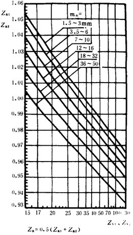 接觸弧長系數(shù)是考慮齒面接觸弧的有效工作長度對(duì)齒面接觸應(yīng)力影響的系數(shù)。當(dāng)齒數(shù)比不等于1時(shí),一個(gè)齒輪的上齒面和下齒面的接觸弧長不一樣。接觸弧長系數(shù)應(yīng)取兩個(gè)齒輪的平均值,即Za=0.5(Za1+Za2),Za1和Za2值可按小齒輪和大齒輪的當(dāng)最齒數(shù) 和 查圖6。