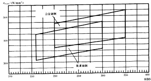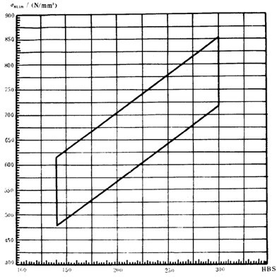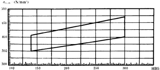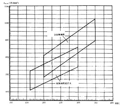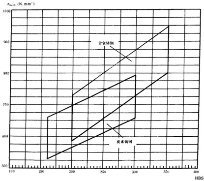 疲勞極限是指某種材料的齒輪經(jīng)長期持續(xù)的重復(fù)載荷(接觸應(yīng)力循環(huán)基數(shù)No=5×107,彎曲應(yīng)力循環(huán)基數(shù)No=3×106)作用后,輪齒保持不破壞時(shí)的極限應(yīng)力。它可由齒輪的負(fù)荷動(dòng)轉(zhuǎn)試驗(yàn)或經(jīng)驗(yàn)統(tǒng)計(jì)數(shù)據(jù)獲得。當(dāng)缺乏資料時(shí),可參考圖10和圖11,根據(jù)材料和齒面硬度取值。鑄鋼、氮化鋼和球墨鑄鐵的疲勞極限見附錄A(補(bǔ)充件)。
