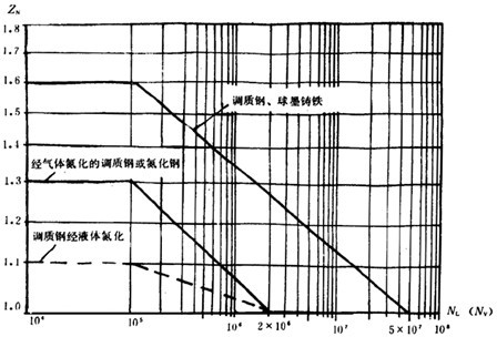 圖12當(dāng)調(diào)質(zhì)鋼和球墨鑄鐵的應(yīng)力循環(huán)次數(shù)NL或NV≥5×107時(shí),ZN=1;氮化鋼的應(yīng)力循環(huán)次數(shù)NL或NV≥2×106時(shí),ZN=1。圖13的應(yīng)力循環(huán)次數(shù)NL或NV≥3×106時(shí),YN=1。
