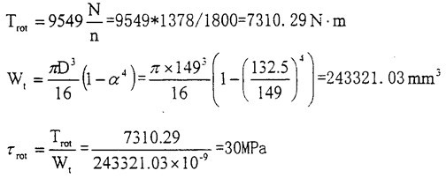 根據(jù)實(shí)際情況計(jì)算出工作時(shí)的剪應(yīng)力:GK2型內(nèi)燃機(jī)車(chē)啟動(dòng)發(fā)電機(jī)ZQF-38TH,115V,38KW,1170~358Or/min;GK2型內(nèi)燃機(jī)機(jī)用柴油機(jī)型號(hào)為MTU16V396TC14,持續(xù)功率為1378KW,旋轉(zhuǎn)角速度為18O0rod/min。柴油機(jī)冷區(qū)液溫度為40℃時(shí)最小啟動(dòng)轉(zhuǎn)矩包括加速余量約8OON.m,曲軸扭矩約75ON.m