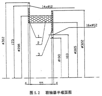 根據(jù)實(shí)際情況觀察可知橡膠塊左右分別有兩塊鋼板,析能上能下均有一些圓孔,通過實(shí)際測量得到聯(lián)軸器的基本尺寸和形狀。由于聯(lián)軸器為軸對稱圖形,故只畫出其截面圖(圖5.2)。