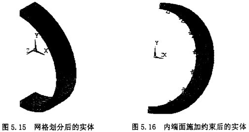 首先,在圓環(huán)內(nèi)端面上施固定約束,選擇Main Menu>Solution>Define Loads>Apply>Structural>Displaedment>On Areas命令,選擇圓環(huán)內(nèi)端面。施加約束后,效果如圖5.16所示。
