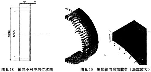 軸向不對中時,根據(jù)實(shí)際情況取中量為ax=5mm,則可以認(rèn)為外端面沿z軸方向的位移為5mm,如圖5.18所示。產(chǎn)生的附加的軸向載荷按照。選擇選擇Main Menu>>Solution>Define Loads>Apply>Structural>Force>Moment>On Nodes命令,選擇圓環(huán)外端面上所有的節(jié)點(diǎn),在出現(xiàn)的對話框中選擇比,并在輸入value文本框中輸入39。加載后的結(jié)果如5.19所示。旁邊為局部放大圖。