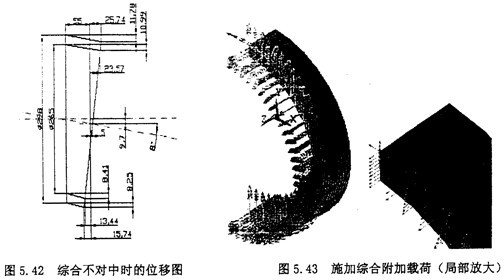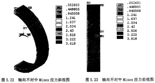重復(fù)5.4.2節(jié)中的(1),(2),(3),(4),(5),(6)步驟。然后開始施加綜合的附加載荷。由于綜合位移使得橡膠圓環(huán)附加的徑向拉應(yīng)力σax,附加的剪應(yīng)力τrad,附加的角向應(yīng)力σax,以及由橡膠圓環(huán)旋轉(zhuǎn)扭矩產(chǎn)生的剪應(yīng)力τrot。所以綜合不對中的應(yīng)力情況應(yīng)該是σaxσax、σaxσrot的疊加。施加綜合附加載荷后的圖形圖5.43所示。