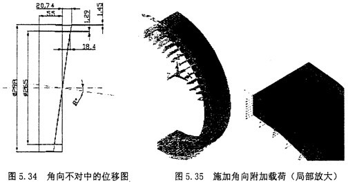 重復(fù)5.4.2節(jié)中的(1),(2),(3),(4),(5),(6)步驟。然后開始施加由于徑向的位移產(chǎn)生的附加剪應(yīng)力。角向不對中時,由于兩軸之間存在一定的夾角,使得橡膠圓環(huán)最上方受到附加的拉應(yīng)力,而圓環(huán)的最下羰則受到附加的壓應(yīng)力,這個附加的拉應(yīng)力σang大小和方問隨著圓環(huán)的旋轉(zhuǎn)角度改變而改變,在最上方時受拉,且絕對值最大,在最下方受壓,絕對值亦最大。而在平衡位置時則變成O。施加角向附加載荷后的圖形如5.35所示。